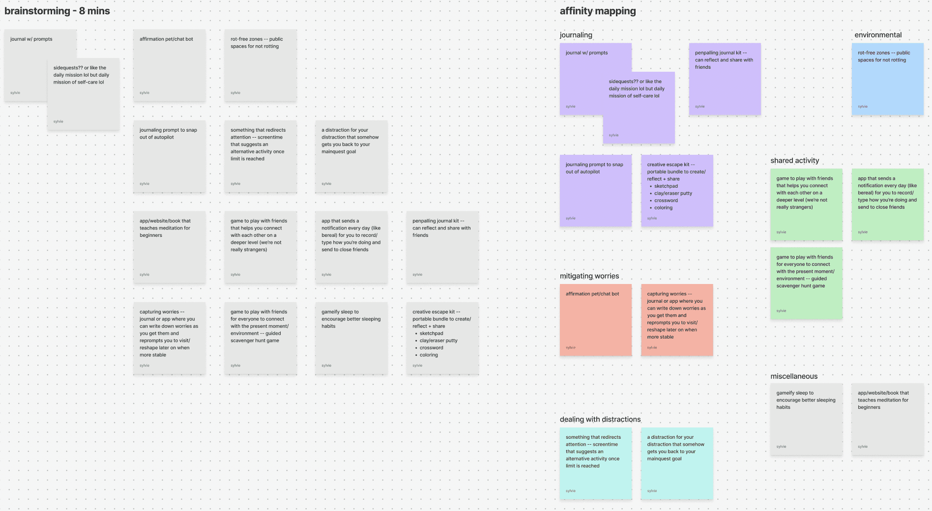Starting with divergent methods, I brainstormed ideas that targeted pain points before affinity-mapping them to find themes; journaling and shared activity were the most frequent themes and provided solutions that checked all the boxes.