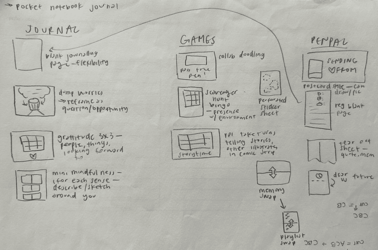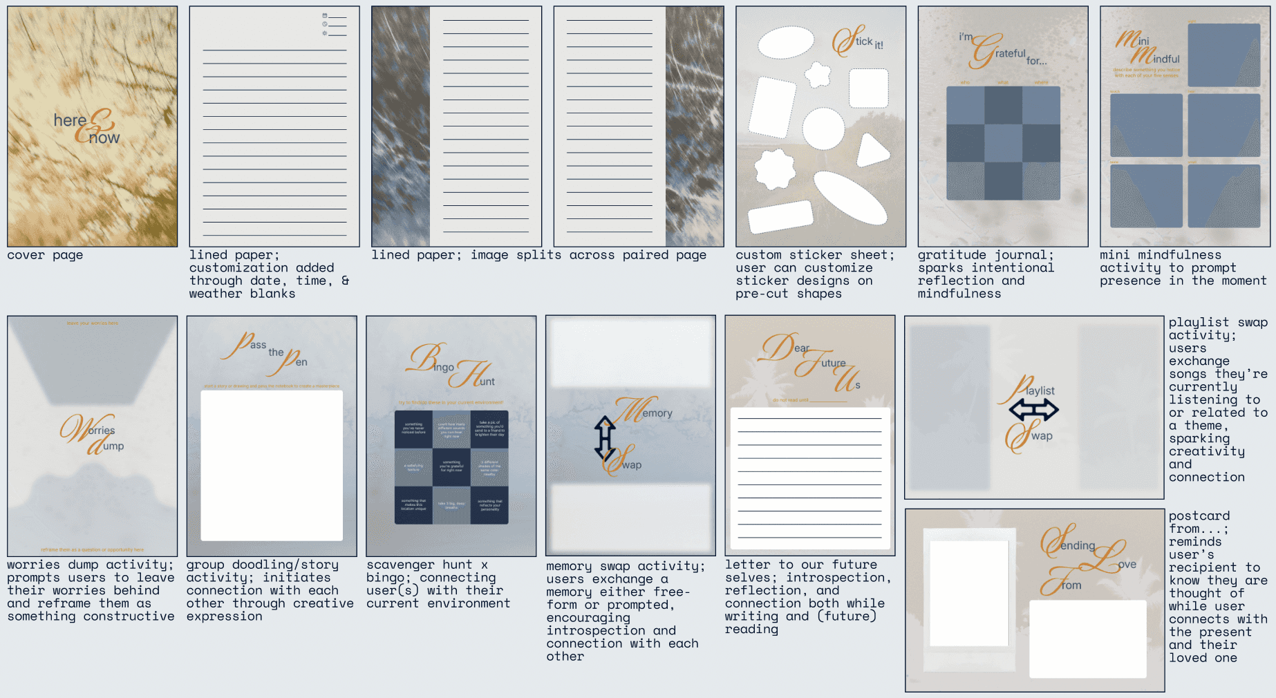 Lo-fi sketches for journal spreads included three main page types (which could also be used in multiple ways):