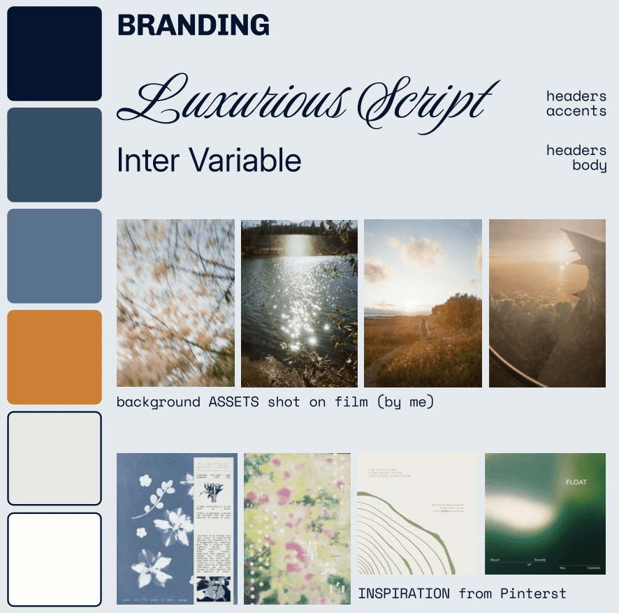 Branding was inspired by inspired by calming, warm, colors & fonts, and ranging a variety of layouts and purposes for flexibility and creativity. Three main background assets were used to symbolize each of the three page categories, utilizing different blend modes for effect.